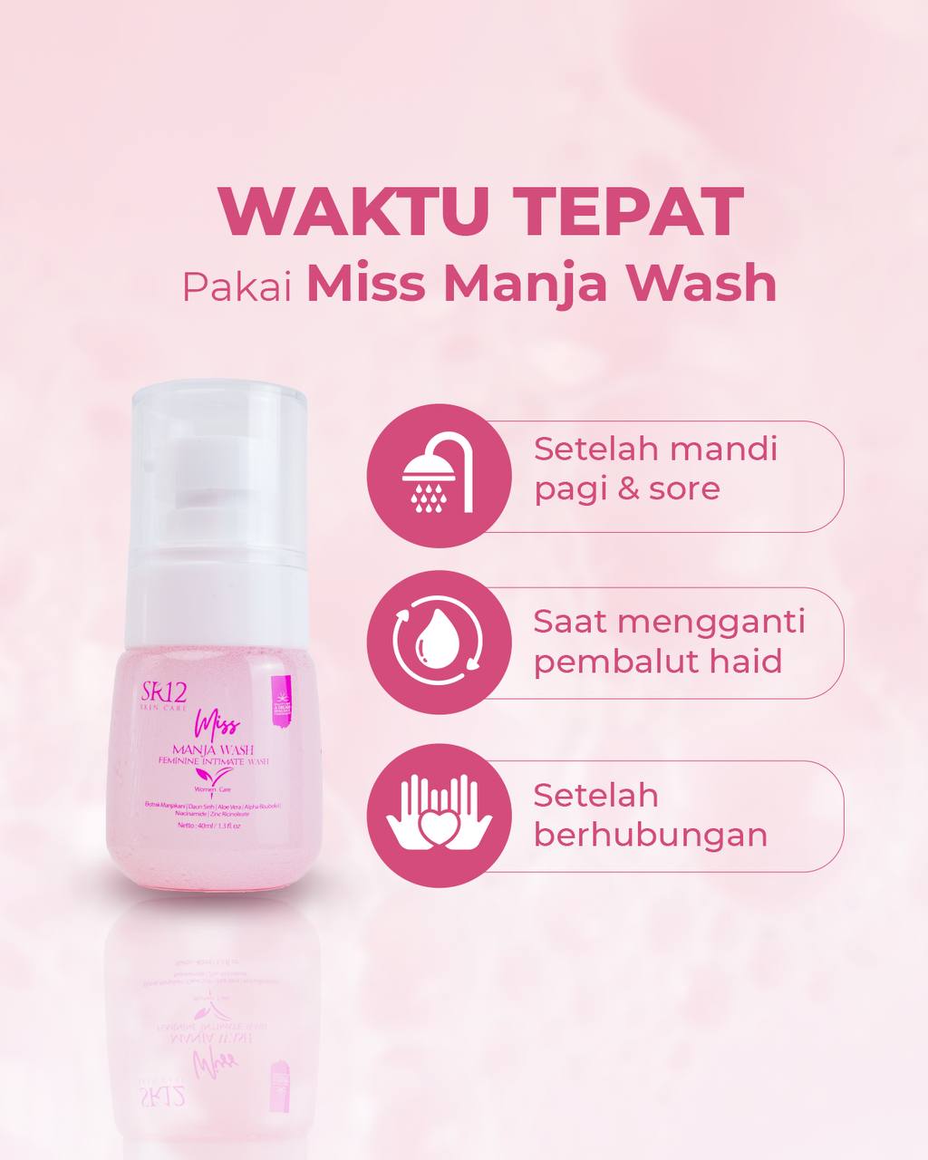 • Miss Manja Wash: Gunakan saat mandi atau setiap hari. Basuh area kewanitaan, tuangkan secukupnya, usapkan lembut, lalu bilas.